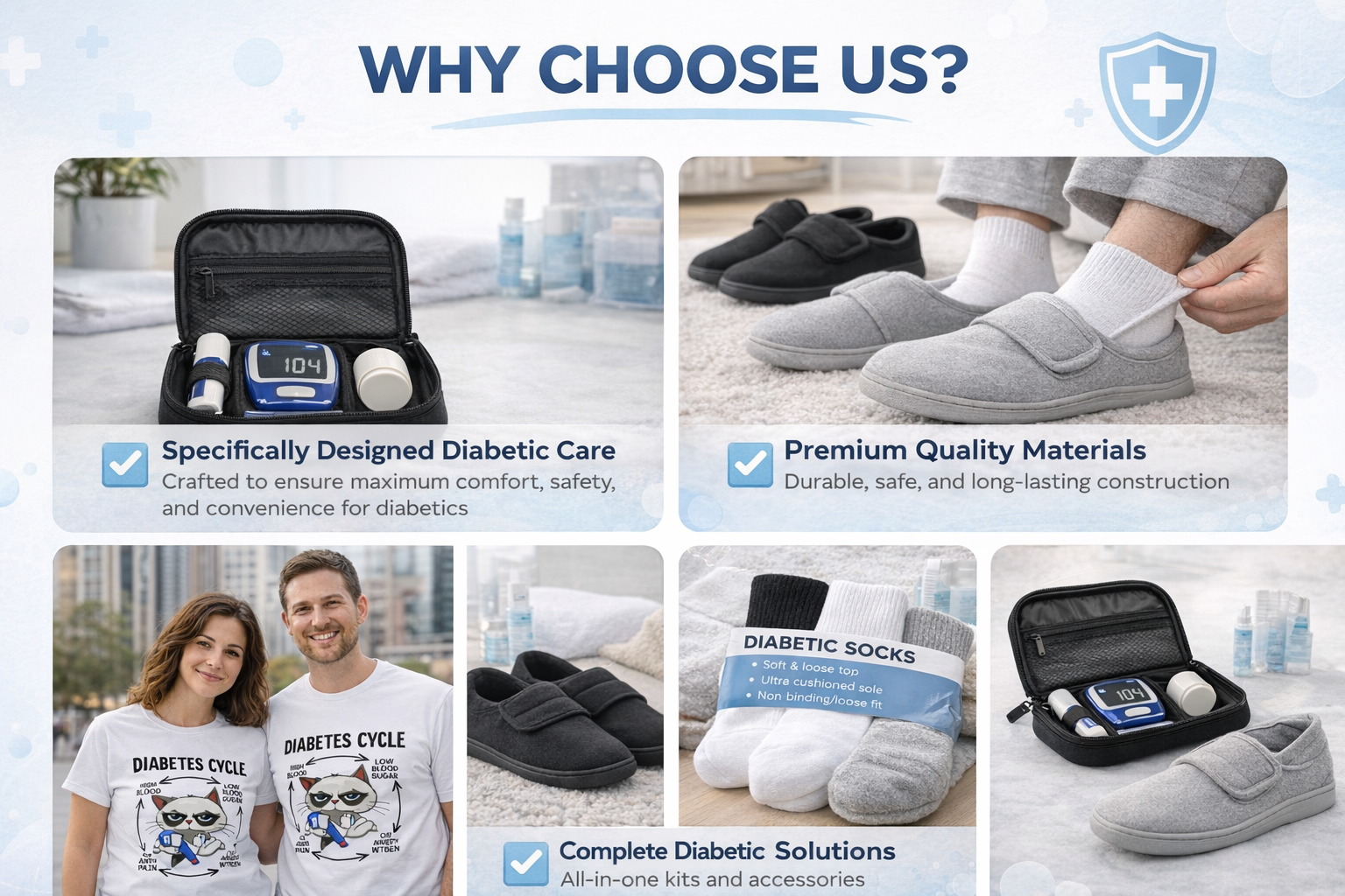 We focus on comfort, safety, and everyday reliability for people living with diabetes. Every product in our store is carefully selected to support daily management, reduce stress, and improve quality of life.